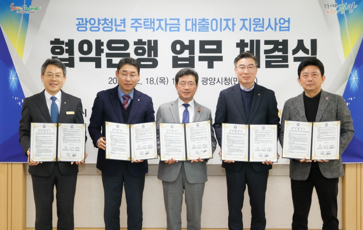 [뉴스노크=김인호 기자] 광양시는 2026년도 청년주택자금 대출이자 지원사업 추진에 앞서 보다 효율적인 사업 운영을 위한 협력 체계를 구축하고자, 지난 19일 시청 만남실에서 관내 4개 금융기관(신한은행, NH농협은행, 광양농협, 동광양농협)과 청년 주택자금 대출이자 지원사업업무협약을 체결했다.