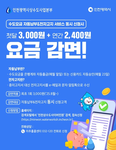 [뉴스노크=김인호 기자] 인천광역시 상수도사업본부는 시민들의 요금 납부 편의를 높이고 행정 효율성을 제고하기 위해 수도요금 전자고지 및 자동납부를 신청하는 시민에게 요금 감면 혜택을 제공한다고 밝혔다.