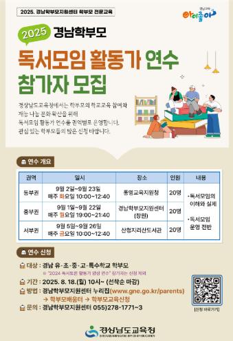 참가 신청은 8월 18일 오전 10시부터 경남학부모지원센터 누리집에서 가능하며, 자세한 내용도 해당 누리집에서 확인할 수 있다.