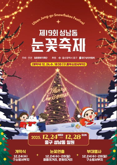 한편, 중구는 성남동 눈꽃축제와 연계해 옛 울산초등학교 앞~보세거리 입구 구간과 젊음의거리 등에 대형 성탄절 나무(크리스마스 트리), 종 모양 조형물, 2026 숫자 조형물 등을 설치해 운영하며 더욱 낭만적인 분위기를 연출할 계획이다.
