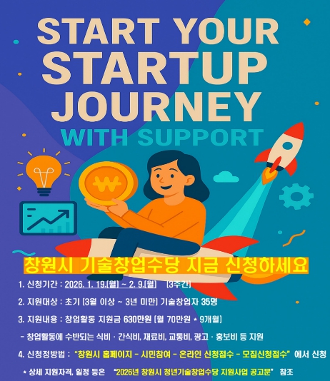 [뉴스노크=김인호 기자] 창원특례시는 1월 19일부터 2월 9일까지 ‘2026년 청년기술창업수당 지원사업’ 참여자 35명을 모집한다고 밝혔다.