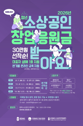[뉴스노크=김인호 기자] 충북도와 (재)충청북도기업진흥원(소상공인지원센터)이 ‘2026년 청년 소상공인 창업응원금 지원사업’의 1분기 참여자 250명을 1월 26일부터 오는 3월 27일까지 선착순으로 모집한다.