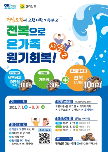 강경문 전남도 고향사랑과장은 “지난 시즌 1에서 큰 호응을 얻은 전복 이벤트가 더 많은 기부자에게 특별한 보람과 혜택을 함께 누릴 수 있도록 기획했다”며 “고향을 응원하는 마음 하나가 단순한 기부를 넘어 전남의 미래를 바꾸는 힘이 될 것”이라고 말했다.