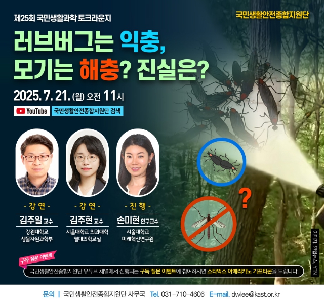 이야기 마당(토크라운지)은 국민적 관심도가 높은 다양한 사회문제에 대한 과학적 분석을 통해 국민들의 이해를 돕는 역할로 7월 21일 11시에 개최되는 이번 이야기 마당(토크라운지)에서는 요즘 언론에서 자주 언급되고 있는붉은등우단털파리(러브버그)에 대해 다룬다.