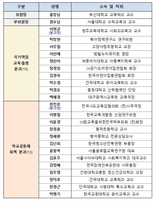 위원으로는 학계·연구원·교육현장 등 다양한 분야의 전문가 48명이 위촉됐다. 전체 위원장은 이재명 정부 국정기획위원회 사회2분과장(교육분야 총괄)을 역임한 홍창남 교수(부산대학교)가 맡아, 정책자문위원회에서 제시하는 교육정책 관련 의견이 국정과제와 밀접한 연관성을 지닐 수 있도록 했다.