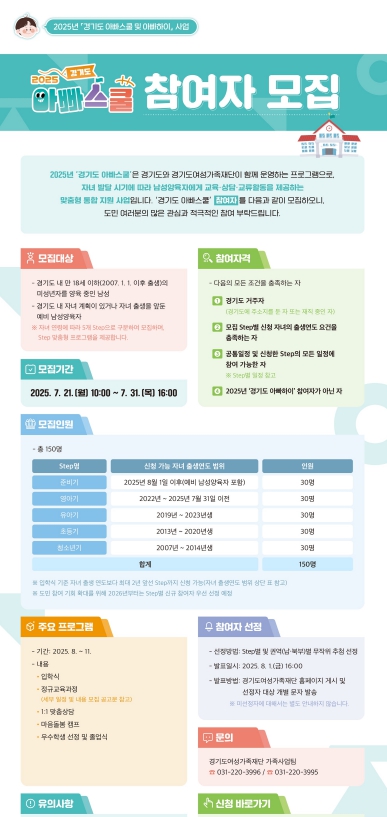 모집 대상은 도내 거주하거나 재직 중인 남성으로, 18세 이하(2007년 1월 1일 이후 출생)의 자녀를 양육 중이거나 자녀 계획 또는 출산을 앞둔 예비 남성양육자이다. 자녀 발달 단계에 따라 준비기, 영아기, 유아기, 초등기, 청소년기 5개 단계(Step)로 구분되며, 올해는 시범 사업으로 각 단계(Step)별 30명씩 총 150명 모집한다.