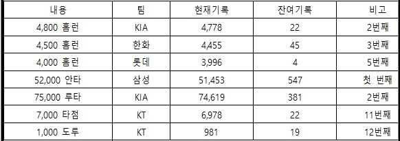 ▲ KBO 리그 후반기 주요 달성 예상 기록표(통산팀 타자) |