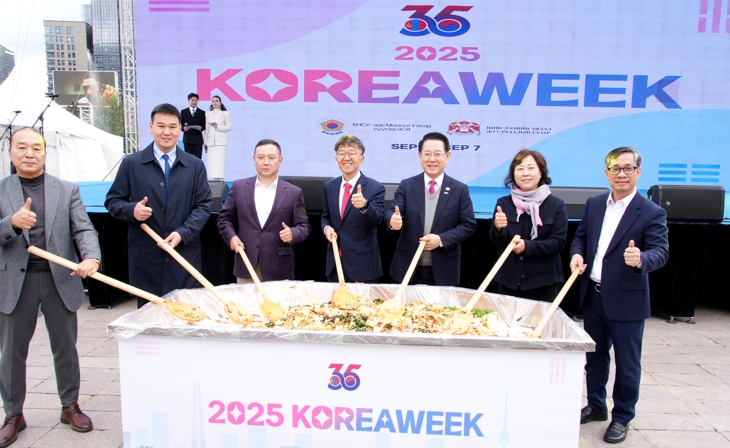 ▲ 몽골을 방문 중인 김영록 전라남도지사가 6일(현지 시간) 울란바토르에서 열린 2025 한국주간(Korea Week)행사 개막식에서 주요 내·외빈들과 한국 음식인 대형 비빔밥을 비비는 퍼포먼스를 하고 있다. |
