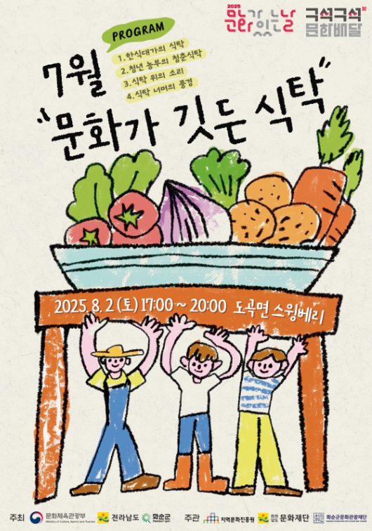 [뉴스노크=김인호 기자] 문화체육관광부·전라남도·화순군이 주최하고, 지역문화진흥원·전라남도문화재단·화순군문화관광재단에서 주관하는 '2025년 문화가 있는 날 – 구석구석 문화배달' 사업 ‘7월 문화가 깃든 식탁’ 행사가 오는 8월 2일 오후 5시부터 8시까지 전라남도 화순군 도곡면 스윙베리(죽청리 613-53)에서 개최된다.