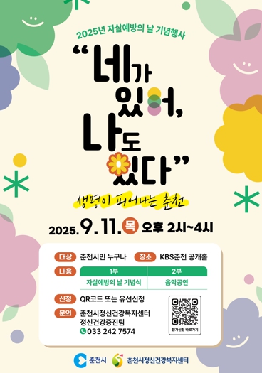 춘천시(시장 육동한)와 춘천시정신건강복지센터가 오는 11일 오후 2시 KBS춘천 공개홀에서 2025년 자살예방의 날 기념행사를 개최한다.