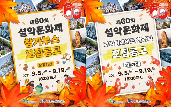 [뉴스노크=김인호 기자] (재)속초문화관광재단은 오는 10월 24일부터 26일까지 3일간 속초 엑스포 잔디광장 및 설악로데오거리 일원에서 열리는 ‘제60회 설악문화제’의 성공적인 개최를 위해 지역문화 체험부스 및 거리퍼레이드 참가자를 모집한다.