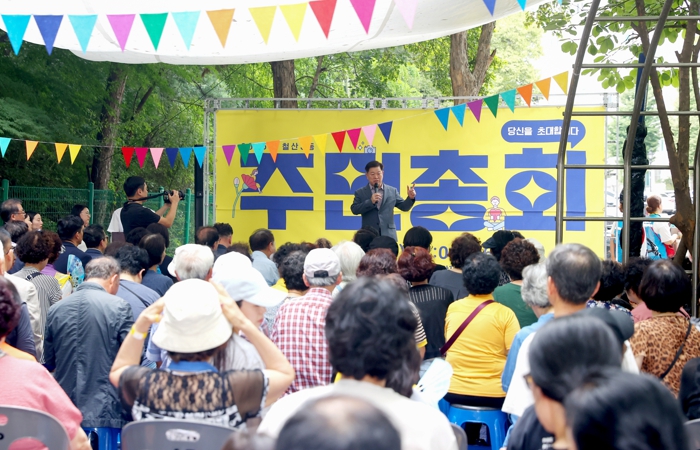 ▲ 박승원 광명시장이 지난 6일 열린 철산3동 주민총회에 참석해 인사말을 하고 있다. |