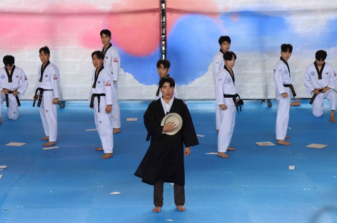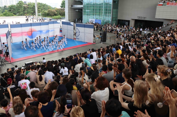 약 50명으로 구성된 시범단이 화려한 고난도 기술로 약 60분간 태권도 시범공연을 선보이자 관중석 여기저기서 탄성과 함께 박수가 쏟아졌다.