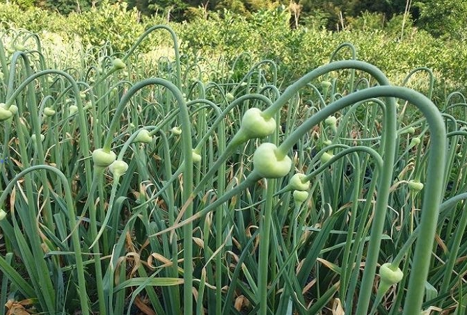 마늘 주아는 마늘 꽃대(쫑) 끝에 달리는 작은 알맹이로 일반 마늘 종구에 비해 바이러스 및 병해충에 강해서 종구 대신 파종하여 품질이 좋은 마늘을 생산할 수 있다.