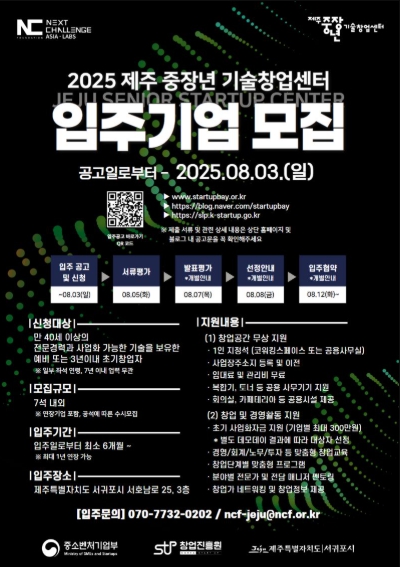 ▲ 제주 중장년 기술창업센터, 2025년 신규 입주기업 하반기 모집 실시 |