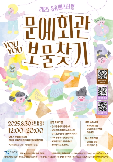 올해 유유페스티벌은 기존의 물총놀이 중심의 축제에서 벗어나, 공연과 체험 중심의 문화축제로 새롭게 변화한다. ‘문예회관 보물찾기’라는 주제로, 시민들이 양주시문화예술회관 곳곳에서 다양한 공연과 체험을 즐기며 문화 속 보물을 찾는 스탬프 투어 형식으로 운영될 예정이다.