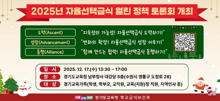 이승준 도교육청 학교급식보건과장은 “자율선택급식은 학생과 학부모의 신뢰 속에서 꾸준히 성장해 온 경기교육의 핵심 정책”이라며 “올해 논의된 방향과 현장의 의견을 토대로 통합지원 체계를 강화해 경기도가 미래학교급식을 선도할 수 있도록 노력하겠다”고 말했다.