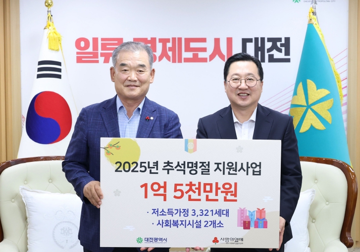 [뉴스노크=김인호 기자] 대전시는 9월 22일 시청에서 대전사회복지공동모금회로부터 추석 명절을 맞아 저소득가정을 돕기 위한 성금 1억 5천만 원을 기탁받았다. 이날 행사에는 유재욱 대전사회복지공동모금회 회장이 참석해 이장우 대전시장에게 성금을 전달했다. 시는 기탁금 중 1억3,500만 원을 저소득 3,321가구에 현금으로 지원하고, 나머지 1,500만 원은 쪽방상담소와 이주외국인종합복지관의 명절맞이 행사에 사용할 계획이다.