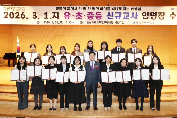 [뉴스노크=김인호 기자] 충청북도교육청은 26일 오후, 교육연구정보원 시청각실에서 2026. 3. 1.자 유·초·중등·특수·비교과 신규교사 296명에게 임명장을 수여했다.