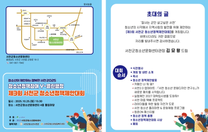 [뉴스노크=김인호 기자] 서천군청소년문화센터는 청소년들이 건강하고 행복한 삶을 꿈꾸는 지역사회에 대해 생각하고 청소년의 시각에서 서천군의 발전을 위한 정책을 제안하는 '제 3회 서천군 청소년정책제안대회'를 오는 10월 25일에 개최한다.