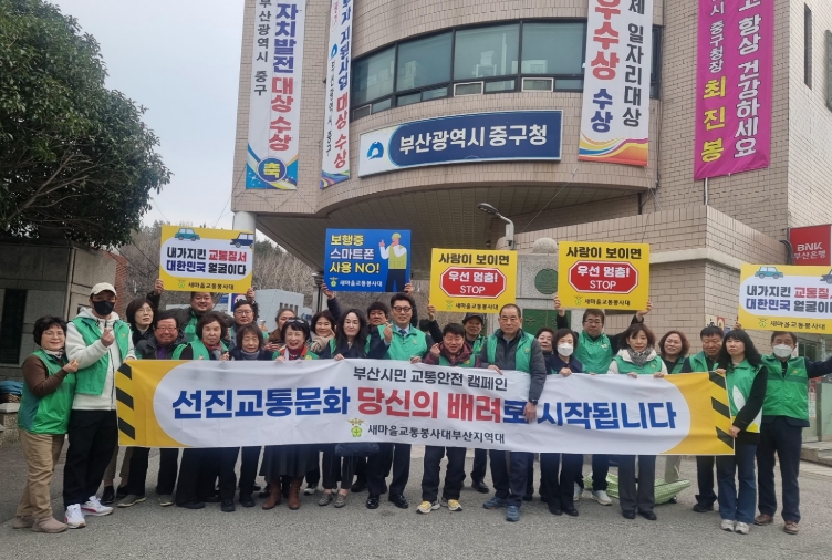 [뉴스노크=김인호 기자] 부산광역시중구새마을회(회장 이형목)는 지난 19일 중구청 앞에서 ‘부산시민 교통안전 캠페인’을 펼쳤다. 회원들은 현수막과 피켓을 이용해 시민들에게 교통법규 준수의 중요성을 알리고, 안전한 보행환경 조성에 적극 동참해 줄 것을 당부했다.
