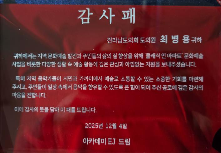 | ▲ 최병용 전남도의원, ‘생활 속 문화예술’ 확산 공로 감사패 수상 |