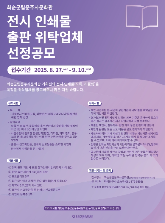 [뉴스노크=김인호 기자] 전남 화순군은 28일 화순군립운주사문화관 기획전 ‘스며들고 피어나다’展 전시 내용을 담은 인쇄물 제작을 위해 출판 전문업체를 모집한다고 밝혔다.