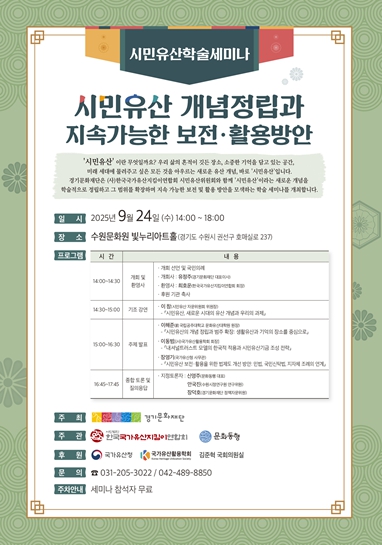 [뉴스노크=김인호 기자] 경기문화재단은 오는 10월 24일 오후 2시, 수원문화원 빛누리아트홀에서 ‘시민유산 개념정립과 지속가능한 보전·활용방안’ 학술 세미나를 개최한다고 밝혔다. 세미나는 문화유산을 소수 전문가의 영역에서 시민 모두의 유산으로 확장하고, 그 가치를 지속가능하게 보전, 활용하는 방안을 모색하기 위해 기획됐다.