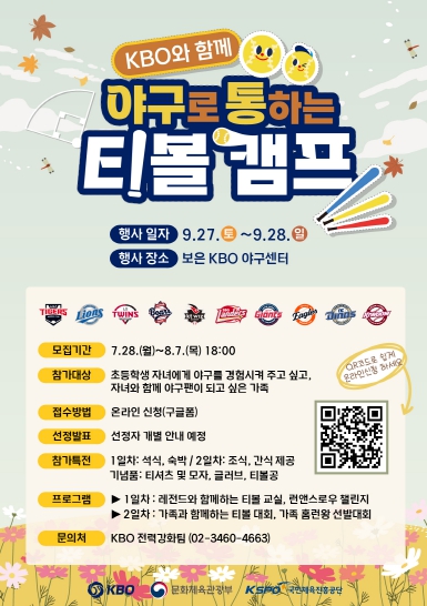 [뉴스노크=김인호 기자] KBO는 ‘2025 제2차 야구로 통하는 티볼캠프’에 참가할 가족을 오늘(28일)부터 8월 7일(목) 오후 6시까지 모집한다.