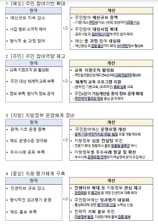 행정안전부는 주민참여예산제도가 현장에서 더욱 활성화되도록 주민, 전문가 등의 의견을 수렴해 다음과 같은 중점 추진 과제를 마련했다.
