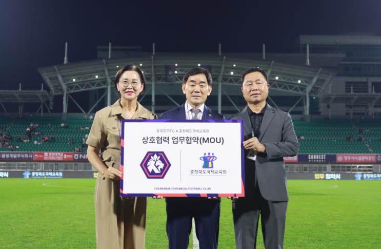 [뉴스노크=김인호 기자] 충청북도교육청 직속기관인 국제교육원은 지난 27일 저녁, 청주종합운동장에서 충북청주프로축구단과 이주배경 학생들의 스포츠 문화체험 확대 및 협력 활성화를 위한 업무협약을 체결했다고 밝혔다.