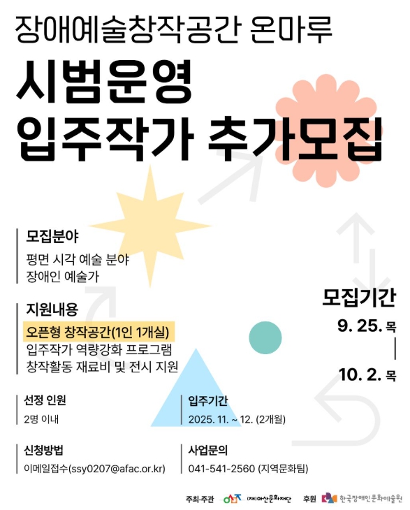 [뉴스노크=김인호 기자] (재)아산문화재단은 ‘2025년 장애예술 거점 창작공간 운영 지원사업 '장애예술창작공간 온마루'’에 참여할 장애인 예술가 2명을 10월 2일까지 추가로 모집한다고 밝혔다.