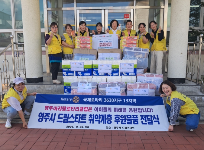 [뉴스노크=김인호 기자] 영주아리랑로타리클럽(회장 안외숙)이 추석을 맞이하여 29일 영주시드림스타트에 이불·화장지·컵라면등 100만 원 상당의 물품을 전달했다.