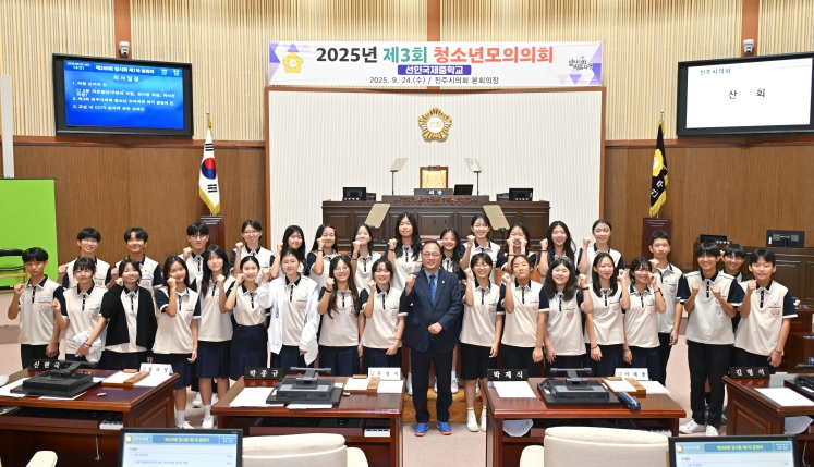 [뉴스노크=김인호 기자] 진주시의회는 24일 본회의장에서 선인국제중학교 학생 31명이 참여한 가운데 ‘2025년 제3회 청소년 모의의회’를 개최했다.