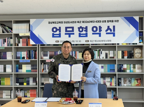 [뉴스노크=김인호 기자] 경상북도교육청 의성도서관은 1월 15일 육군 제3260부대 4대대, 의성군 가족센터와 각각 지역 독서문화 활성화를 위한 업무협약식을 체결했다고 밝혔다.