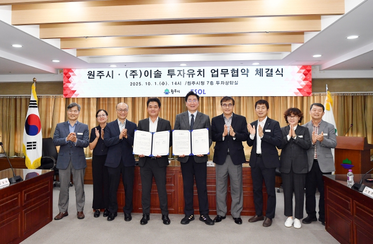 [뉴스노크=김인호 기자] 원주시는 10월 1일 오후 2시, 시청 7층 투자상담실에서 ㈜이솔(대표 김병국)과 투자유치 협약(MOU)을 체결했다. 이번 협약은 총 505억 원 규모의 투자로, 부론일반산업단지에 소형 방사광가속기와 첨단 EUV 반도체 검사장비 연구·생산시설을 구축하는 사업이다. EUV(Extreme Ultra-Violet)는 반도체 초미세 공정(7nm 이하)에 필수적인 광원이다.
