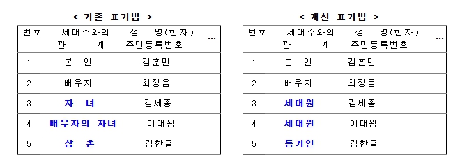 앞으로 등·초본에는 세대주의 배우자 외 가족(부모, 조부모, 형제자매 등)은 ‘세대원’, 그 외에는 ‘동거인’으로 표기된다. 다만, 민원인이 희망하는 경우 기존 표기법대로 등·초본에 상세한 가족 관계를 표기할 수 있다.