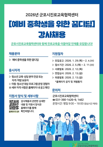 [뉴스노크=김인호 기자] (재)군포시청소년재단 군포시진로교육협력센터는 관내 예비중학생의 학교 적응과 진로 기초 역량 강화를 위해 '2026년 군포시진로교육협력센터 예비중학생을 위한 꿈디딤' 프로그램에 참여할 강사를 채용한다고 밝혔다.