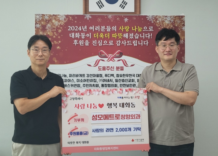 이봉재 대화동장은“지역사회의 소외된 이웃을 위해 따뜻한 나눔을 실천해 주신 성모메트로정형외과에 감사하다”며, “라면 2,000개는 후원자의 뜻에 따라 도움이 필요한 가구에 신속하고 공정하게 전달해 모두가 따뜻한 명절을 보낼 수 있도록 하겠다”고 전했다.