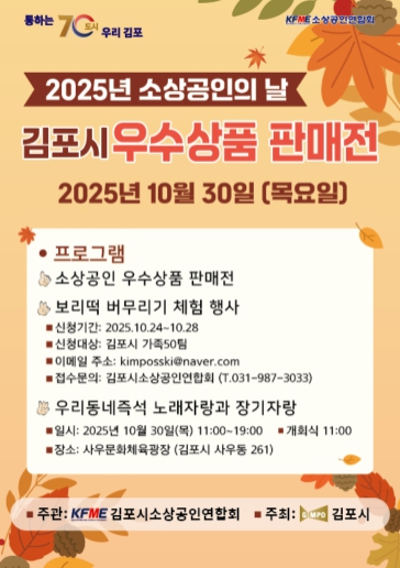 [뉴스노크=김인호 기자] 김포시소상공인연합회에서 오는 10월 30일 사우문화체육광장에서 지역 소상공인의 우수상품을 소개하는 ‘2025 김포시 소상공인 우수상품 판매전’을 개최한다.
