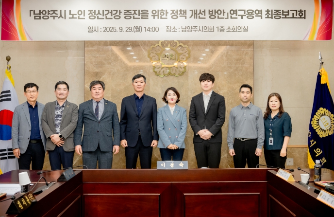 [뉴스노크=김인호 기자] 남양주시의회는 29일 남양주시의회 소회의실에서 의원 연구단체인 ‘남양주시 노인 정신건강 증진을 위한 정책 개선방안 연구모임’의 연구용역 최종보고회를 개최했다.