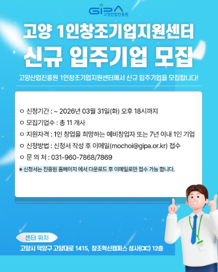 [뉴스노크=김인호 기자] 고양산업진흥원이 ‘고양 1인 창조기업 지원센터’ 2026년 1차 신규 입주기업을 모집한다.