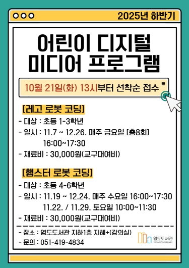 [뉴스노크=김인호 기자] 영도도서관에서 어린이복합문화공간의 디지털 교육환경을 기반으로 관내 어린이들의 디지털 역량 강화와 창의력 향상을 위한 ‘2025년 하반기 어린이 디지털 미디어 프로그램’을 운영한다.
