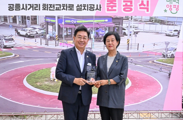 [뉴스노크=김인호 기자] 경기도의회 박명숙 의원(국민의힘,양평1)은 7월 23일 공흥사거리(양평읍 버스터미널 앞) 회전교차로 설치공사 준공식에 참석해 개통을 축하하고, 지역 교통 개선에 기여한 공로로 전진선 군수로부터 공로패를 받았다.