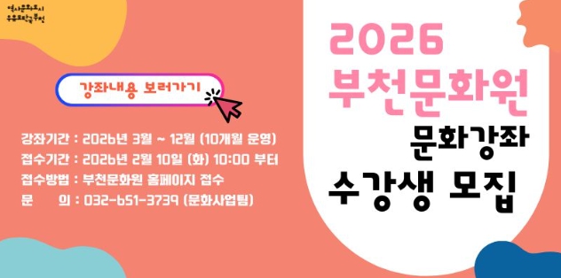 [뉴스노크=김인호 기자] 부천문화원이 2026년 문화강좌 수강생을 모집한다. 올해로 설립 60주년을 맞은 부천문화원은 지역문화의 기틀을 다져온 공공문화예술기관으로, 시민의 일상 속에서 역사·문화·예술의 기반을 넓혀가고 있다.