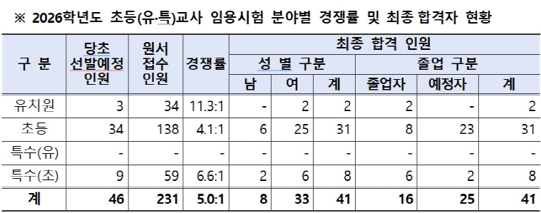 | ▲ 2026학년도 초등(유특)교사 임용시험 분야별 경쟁률 및 최종합격자 현황표 |