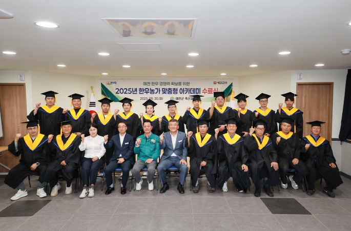 [뉴스노크=김인호 기자] 예천군은 30일 오후 4시, 단샘어울림센터 회의실에서 한우농가 30명이 참석한 가운데 2025년 ‘예천한우 맞춤형 아카데미 수료식’을 개최했다. 이번 수료식에는 김학동 군수도 함께해 수료자들을 격려했다.
