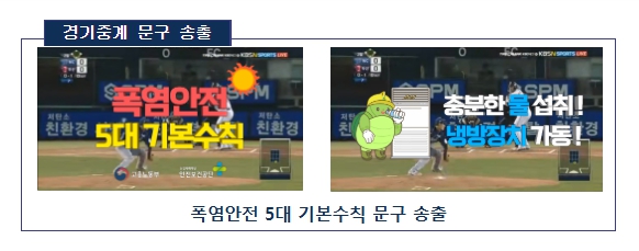 한편 KBS N 스포츠 채널 경기중계를 통해 TV 시청자들에게도 “폭염안전 5대 기본수칙”을 표출(7.17.~)하여 일터에서의 폭염재해 예방의 중요성을 전달했다.