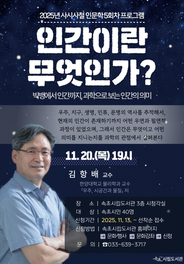 [뉴스노크=김인호 기자] 속초시립도서관은 11월 20일 19시, 도서관 시청각실에서 시민 40여 명을 대상으로 2025 사시사철 인문학 마지막 특강 ‘인간이란 무엇인가?’를 개최한다.