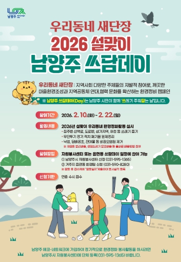 [뉴스노크=김인호 기자] 남양주시는 10일부터 22일까지 시 전역에서 ‘설맞이 우리동네 새단장 남양주 쓰담데이 집중 추진기간’을 운영한다고 밝혔다.